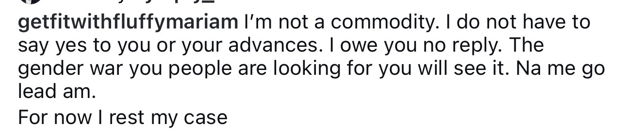 I’m not a commodity. I do not have to say yes to you or your advances. I owe you no reply. The gender war you people are looking for you will see it. Na me go lead am. For now I rest my case. She added