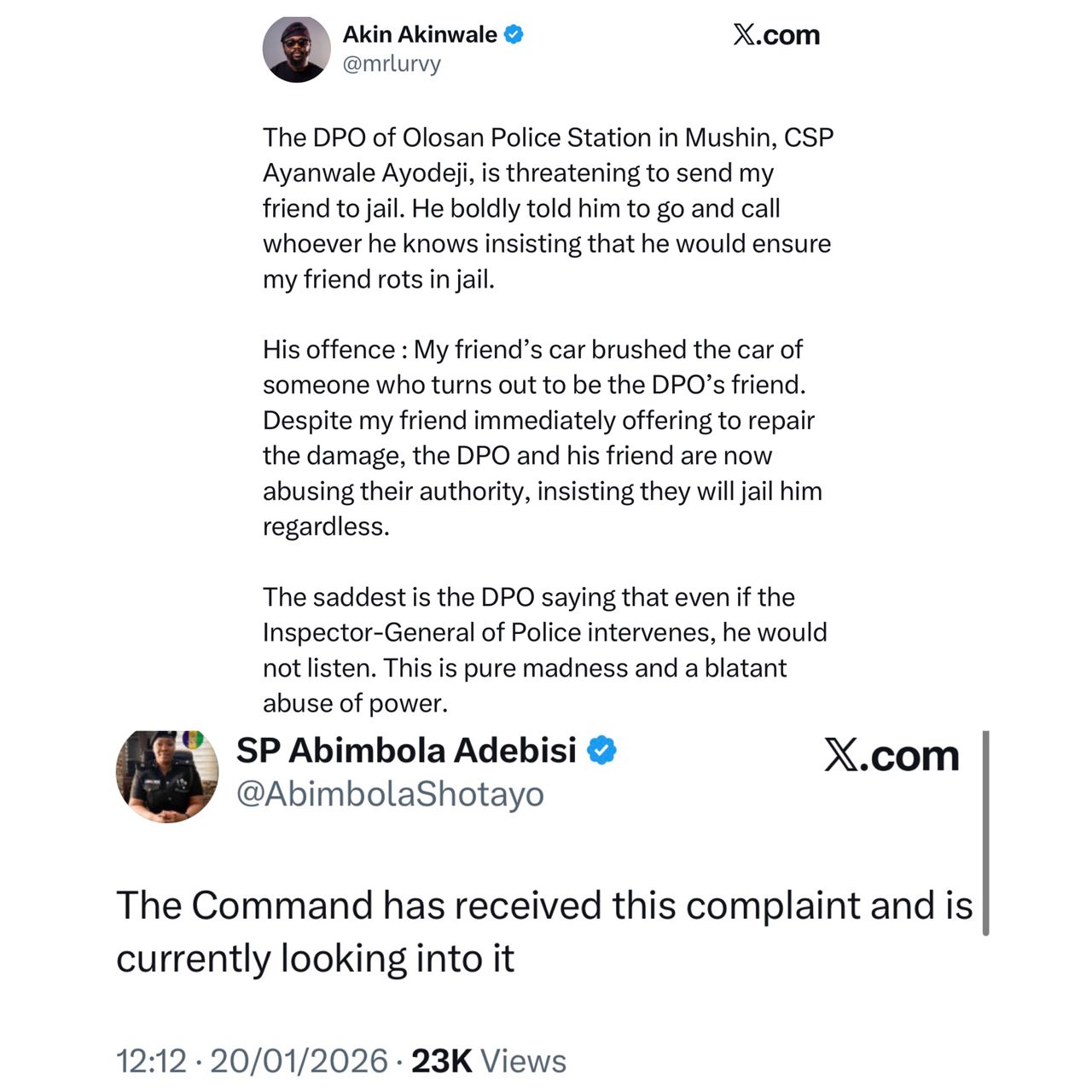 An X-user, Akin Akinwale, had taken to his handle to accuse the police DPO of unfair treatment. According to Akinwale, it all started when his friend’s car “brushed” the vehicle of an individual who turned out to be a friend of the DPO.  He mentioned that despite the motorist’s immediate offer to repair the damage, Akinwale alleged that CSP Ayodeji used his position to threaten the man with imprisonment.