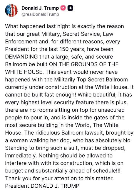 Posting on his Truth Social, Trump wrote: “What happened last night is exactly the reason our great Military, Secret Service, Law Enforcement and, for different reasons, every President for the last 150 years, have been demanding that a large, safe, and secure Ballroom be built on the grounds of the White House.