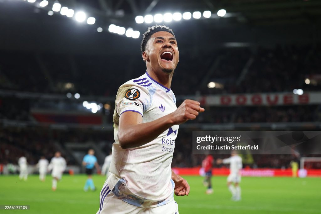 Ollie Watkins of Aston Villa celebrates scoring his team’s first goal during the UEFA Europa League 2025/26 Round of 16 First Leg match between Lille OSC and Aston Villa (Photo by Justin Setterfield/Getty Images)