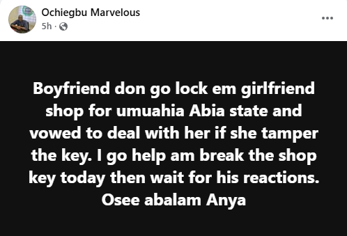 “Boyfriend don go lock em girlfriend shop for umuahia Abia state and vowed to deal with her if she tamper the key. I go help am break the shop key today then wait for his reactions. Osee abalam Anya,” he wrote.