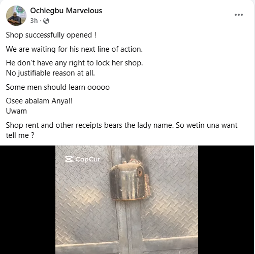 “Shop successfully opened. We are waiting for his next line of action. He don’t have any right to lock her shop. No justifiable reason at all. Some men should learn ooooo. Osee abalam Anya!! Uwam. Shop rent and other receipts bears the lady name. So wetin una want tell me,” he added in an update.
