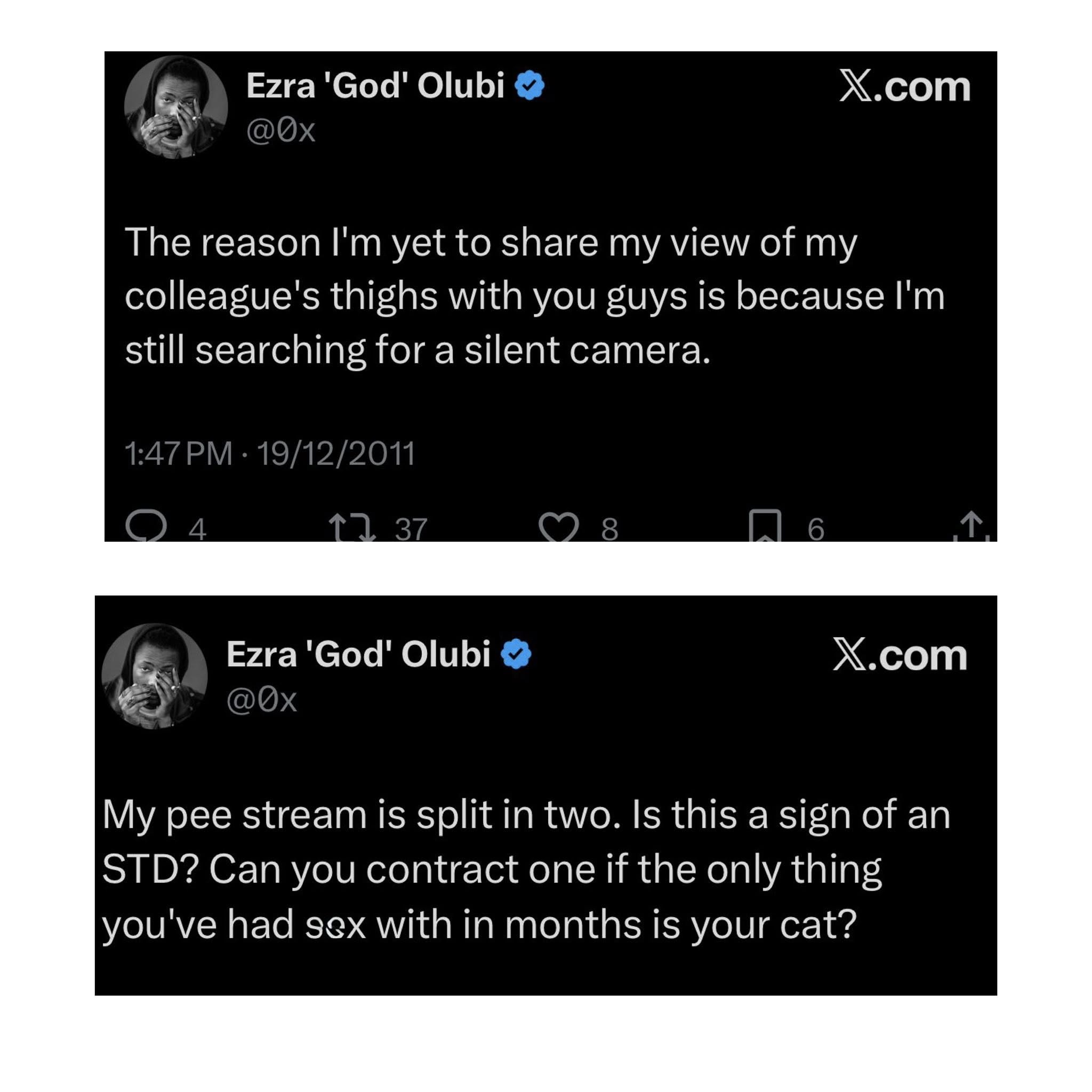 In one of the tweets, Olubi claimed he had been diagnosed with both HIV and Hepatitis B after going to the hospital for a general checkup. Several other posts that resurfaced appear to show him making unsettling jokes about bestiality, including statements implying s3xual contact with a cat and inappropriate s3xual remarks about coworkers and young girls.