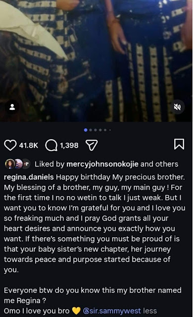 Nollywood star Regina Daniels has taken to Instagram to celebrate her elder brother, Sammy West, as he marks his birthday today. The actress, known for her strong family ties and openness about her personal life, penned an emotional and heartfelt tribute that has since stirred massive reactions across social media.
