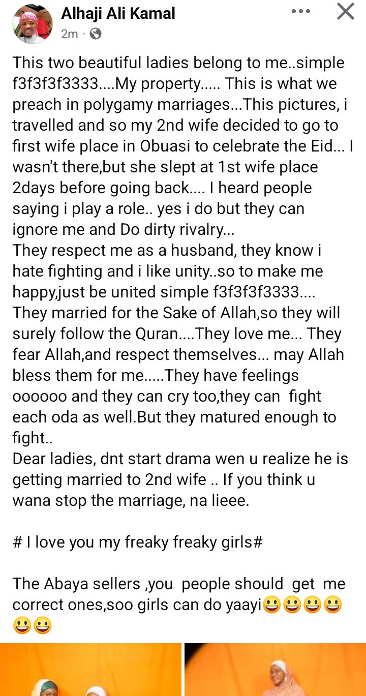 A Ghanaian man, Alhaji Ali Kamal, has showered his two wives, with lovely words, describing them as his property and freaky girls.