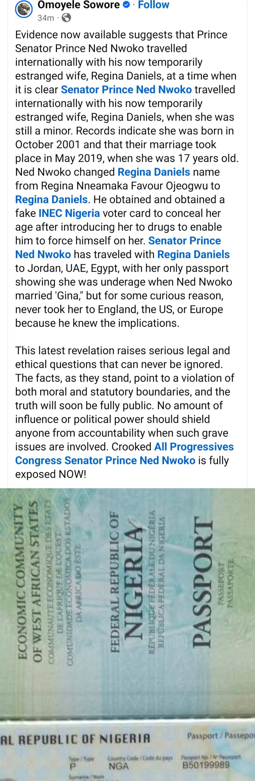 Omoyele Sowore has released Regina Daniels passport and he is questioning  her estranged husband Ned Nwoko’s decision to marry her while she was still a “minor”.