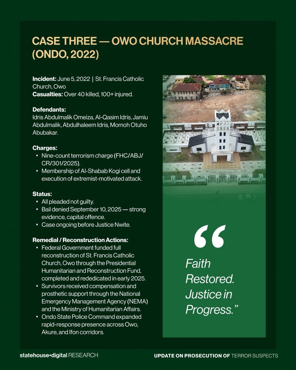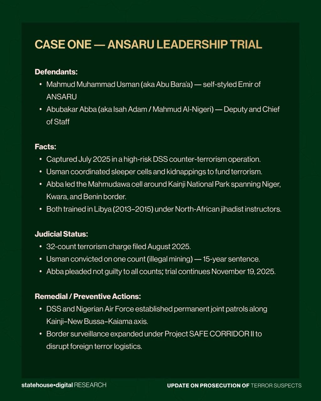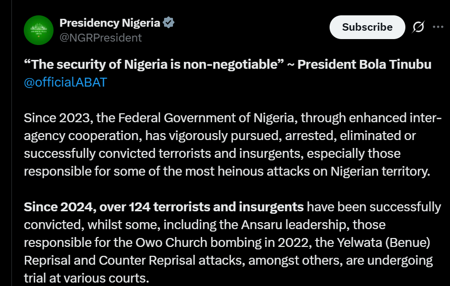 It added that since 2023, enhanced inter-agency cooperation has led to the arrest, elimination, or successful conviction of terrorists and insurgents behind some of the deadliest attacks in the country. More than 124 terrorists have been convicted since 2024, while others including members of the Ansaru leadership and suspects linked to the 2022 Owo church bombing and the Yelwata reprisal attacks in Benue — are currently facing trial.