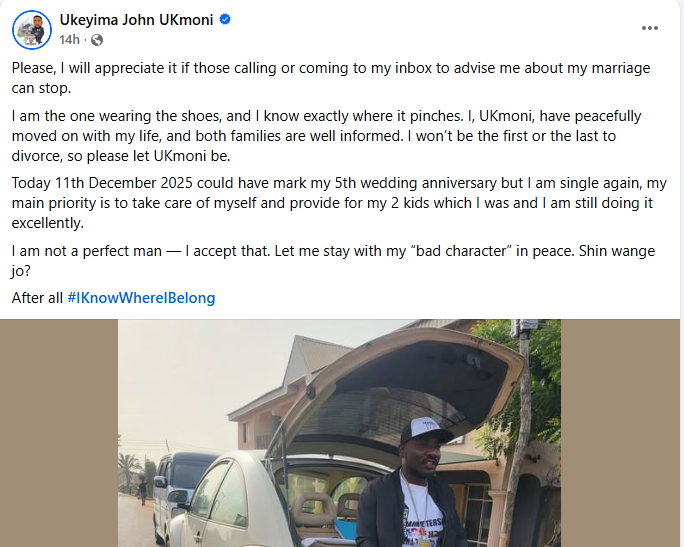He disclosed this in a Facebook post on Thursday, December 11, 2025, on what would have been his 5th wedding anniversary.