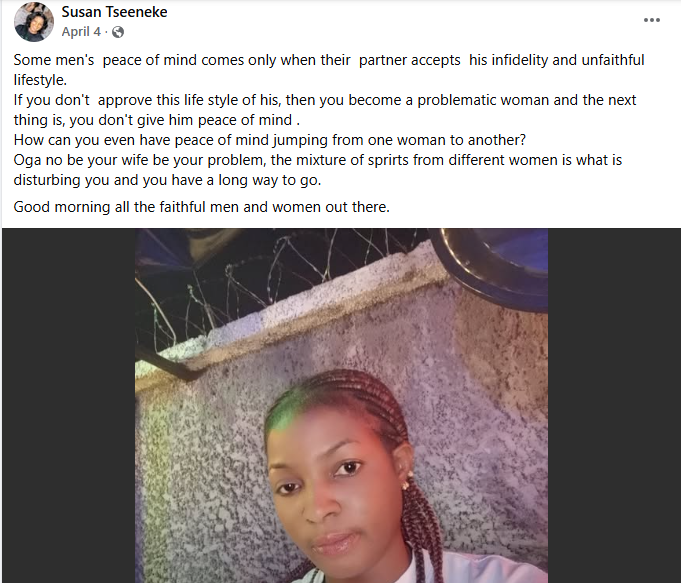 In a Facebook post dated April 4, Susan seemingly reacted to the post, saying that the definition of ‘peace of mind’ for some men, is freedom to cheat.
