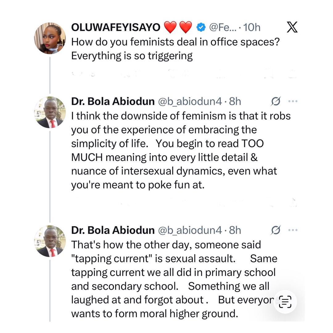 It all started when Abiodun berated feminists for reading meaning to everything that happens around them.