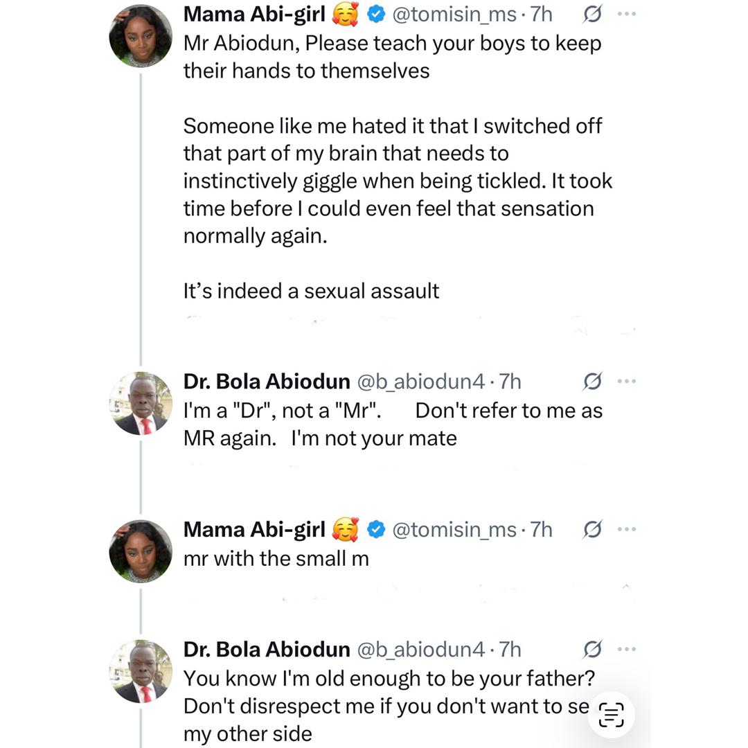 Tomisin saw his comment and immediately pointed out that tapping of current is inappropriate and that Abiodun should endeavour to teach his boys to keep their hands to themselves as ‘’tapping of current” is indeed sexu@l harassment. She said that she experienced it while growing up and that the trauma lived with her for so long.