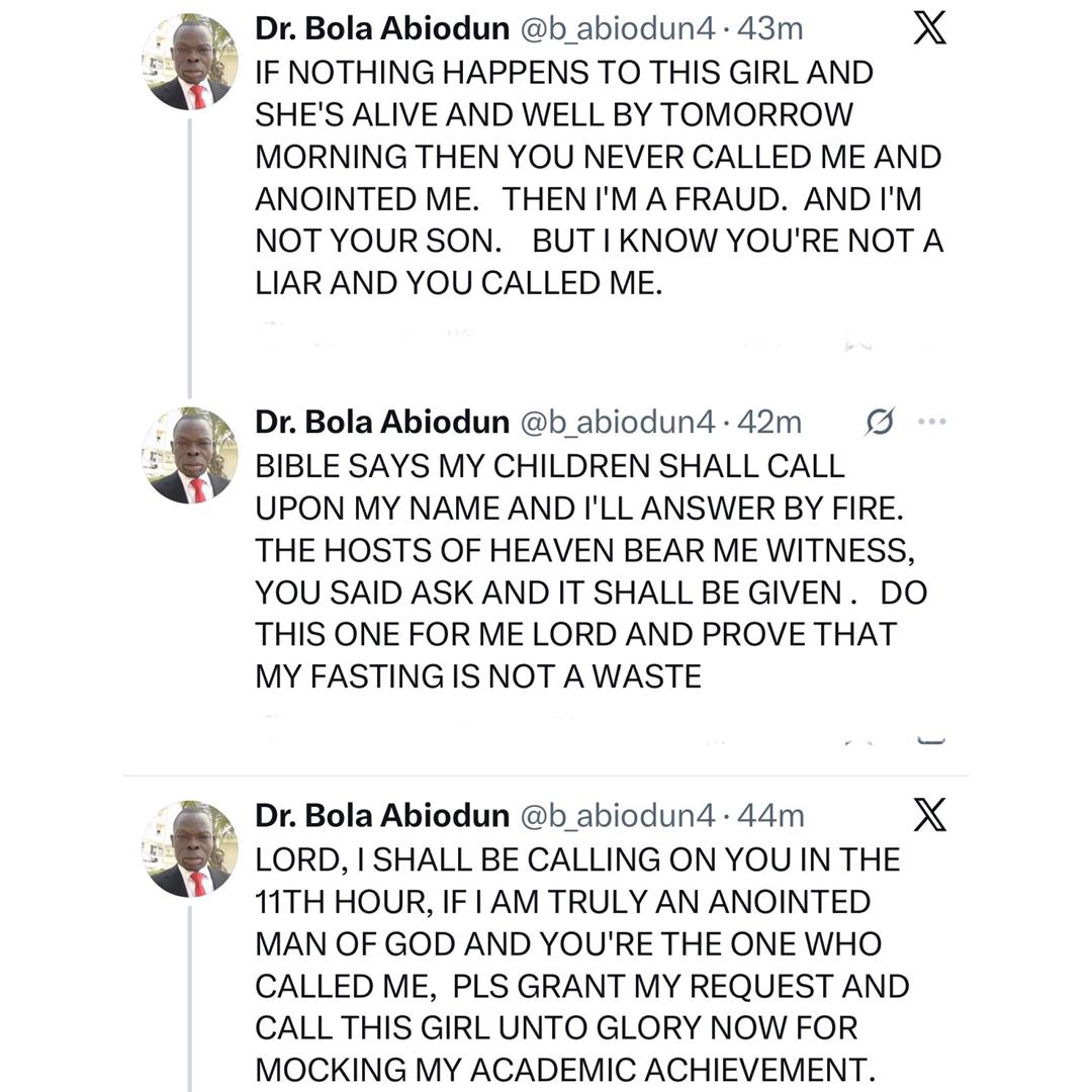 Nigerian Twitter witnessed drama last night, February 23, after a Youth Pastor, Dr Bola Abiodun, rained curses on a Health and Safety professional identified as Tomisin for refusing to address him with his professional title, Dr.