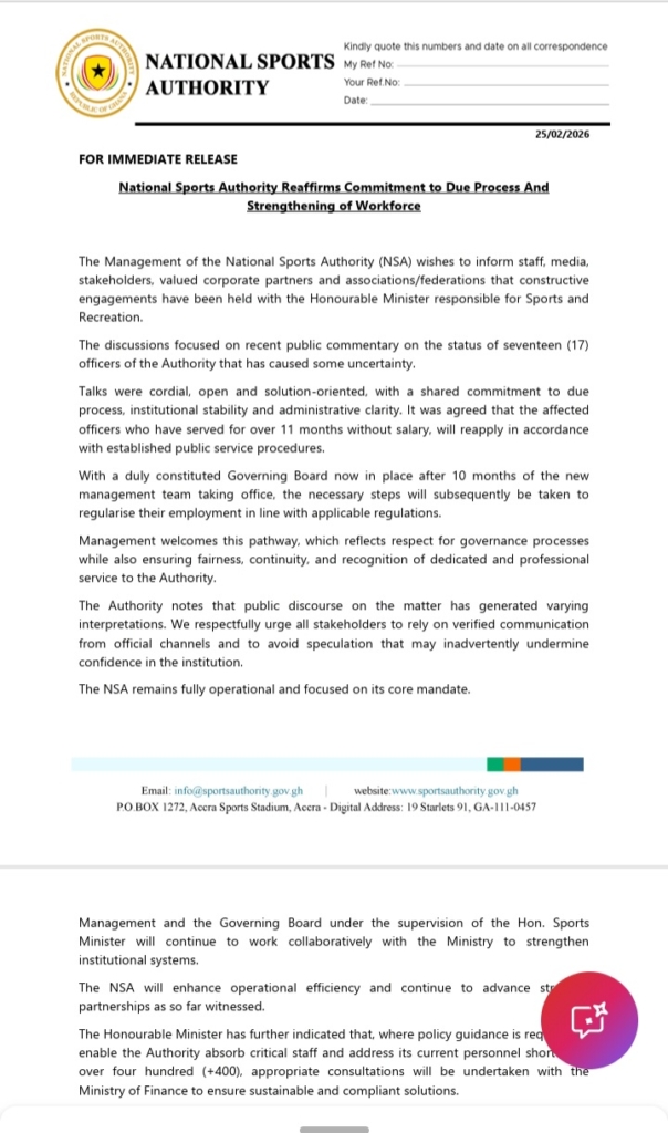 Per Joy Sports intel, the NSA Board had directed Mr Ankrah to revoke the appointments of the 17 staff after it emerged they were recruited without the necessary clearance from the Public Services Commission and the Ministry of Finance; mandatory steps under Ghana’s public sector regulations.