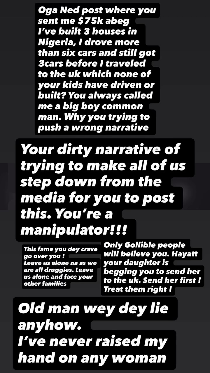 He also accused Ned of lying against actresses Sonia Ogala and Uche Montana when he accused them of being among the people who do drugs with Regina.