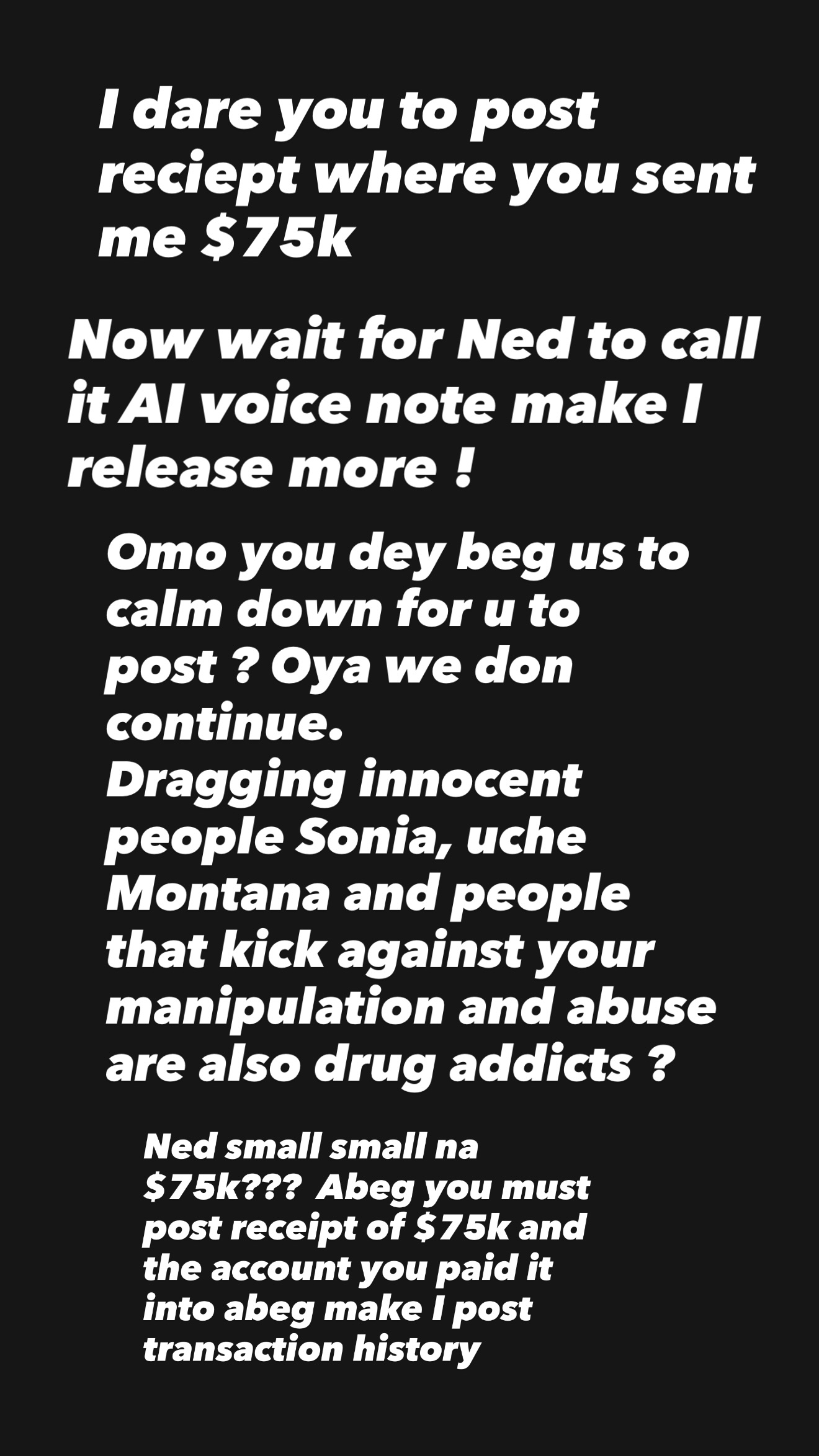 Lawrence also challenged Ned to provide proof of sending him money, specifically the sum of $75k.