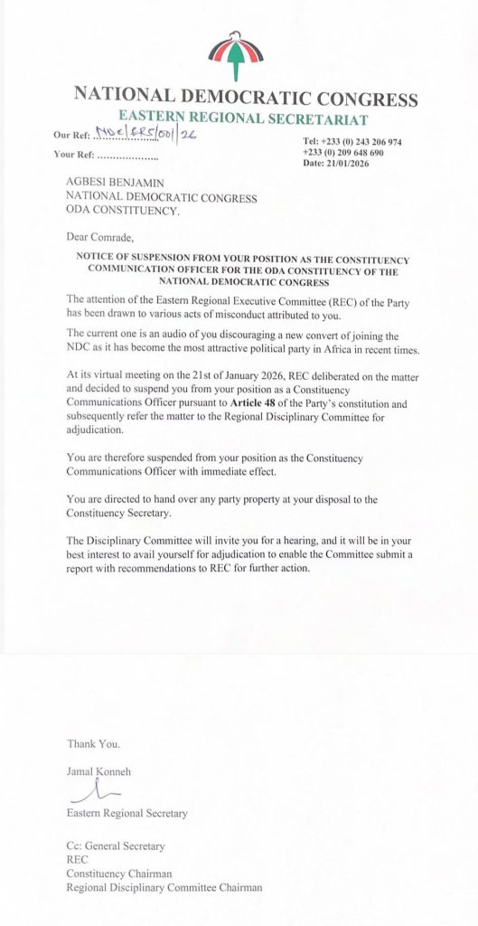 The Eastern Regional Executive Committee (REC) of the National Democratic Congress (NDC) has suspended Agbesi Benjamin from his position as…