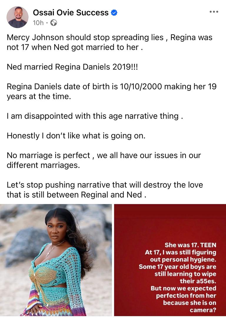 Ossai Ovie Success, an aide to the governor of Delta state, has called out actress Mercy Johnson Okojie, over claims that Regina was 17 years old when she got married to lawmaker, Ned Nwoko.