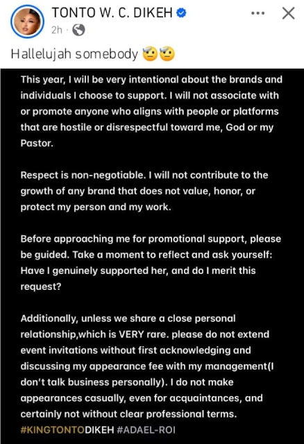 Tonto Dikeh also addressed event invitations, making it clear that professionalism is key. She explained that she does not handle business matters personally and that her appearance at events is strictly based on agreed professional terms. “Unless we share a close personal relationship, which is very rare, please do not extend event invitations without first acknowledging and discussing my appearance fee with my management,” she said.