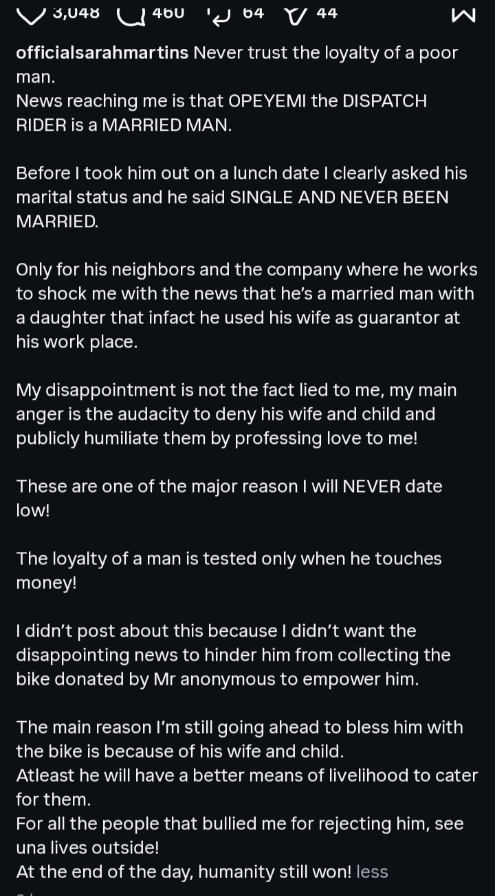 “Never trust the loyalty of a poor man. News reaching me is that OPEYEMI, the DISPATCH RIDER, is a MARRIED MAN,” Martins stated.