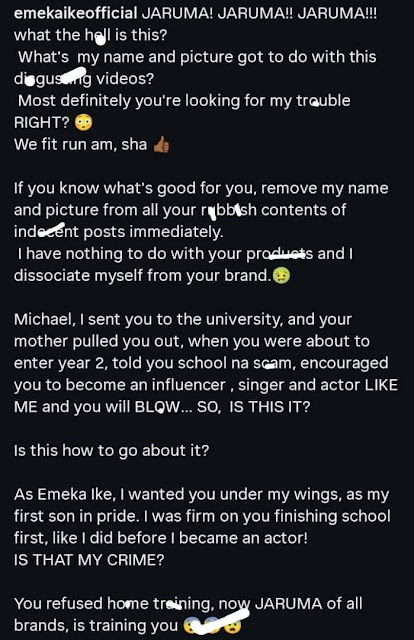 The veteran actor also directly called out Jaruma, accusing her of misleading his son and steering him toward producing risqué content for online engagement and attention. According to Emeka Ike, his son’s actions were not only unexpected but appeared to be heavily influenced by external parties the father deems irresponsible.