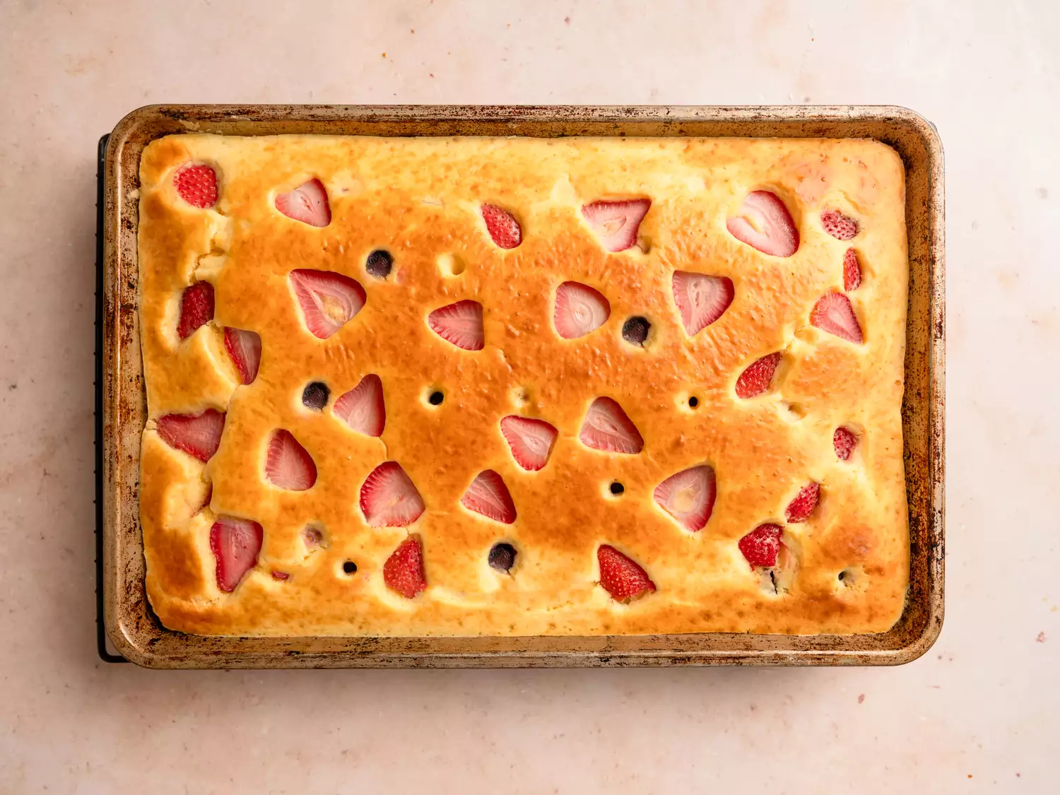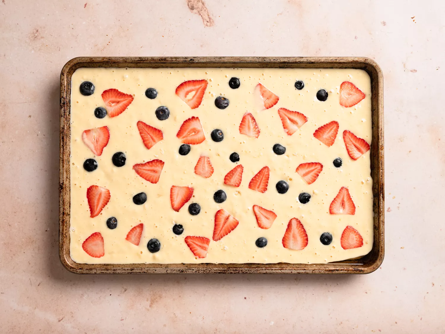 Pour into the prepared sheet pan. Top with strawberries and blueberries.