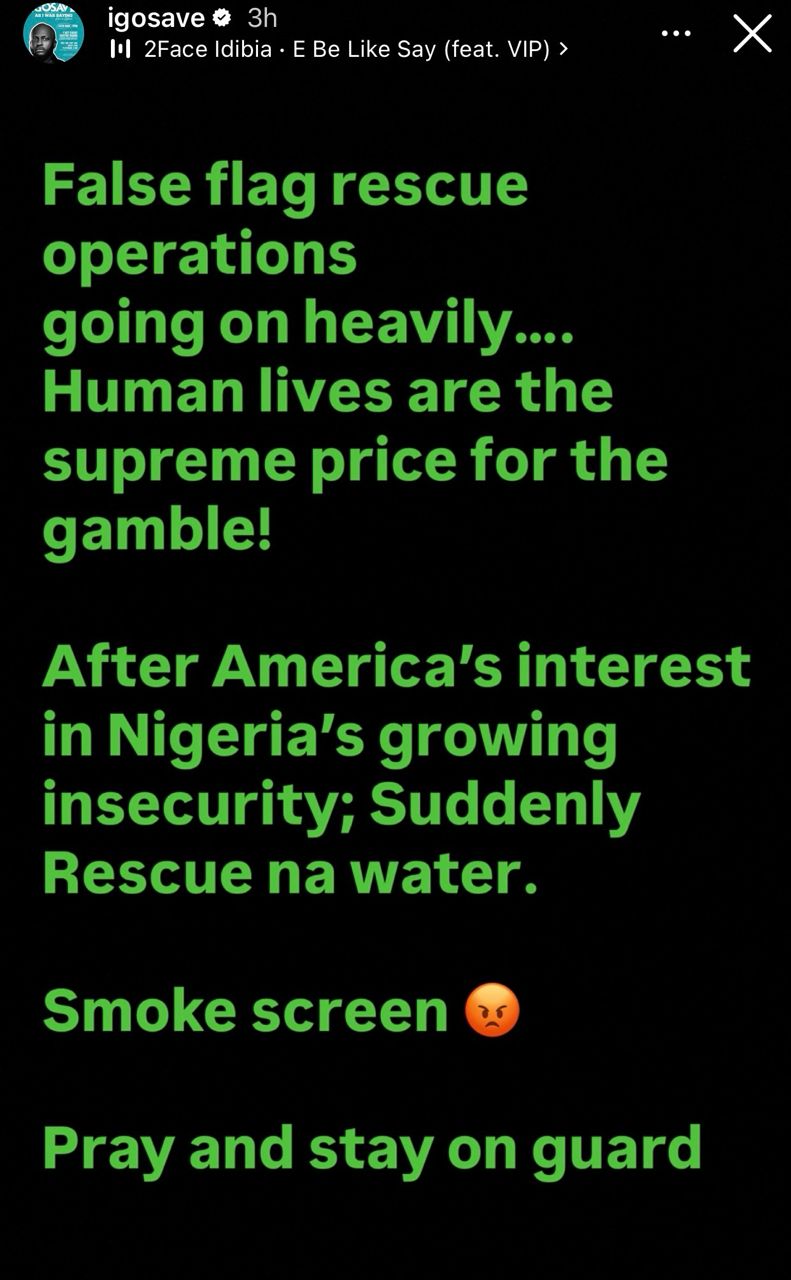 Hours after the announcement was made, I Go Save, raised eyebrows over the rescue operations, tagging them as ‘’false flag rescue operations”. He opined that after the US announced plans to invade Nigeria to stop Christian genocide, ‘’rescue operations” have become easy feats.