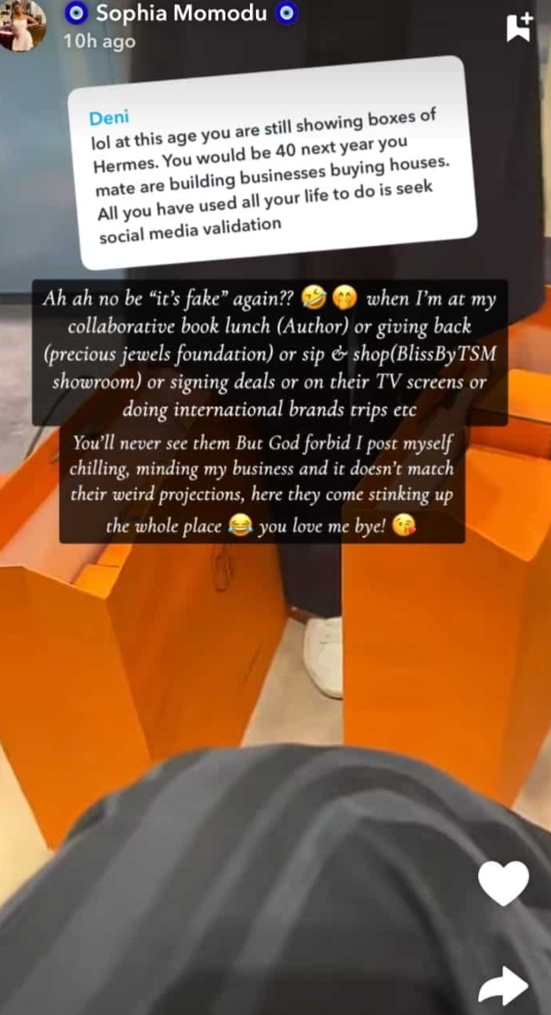 “Lol, at this age, you are still showing boxes of Hermes. You would be 40 next year; your mates are building businesses and buying houses. All you have used all your life to do is seek social media validation”.