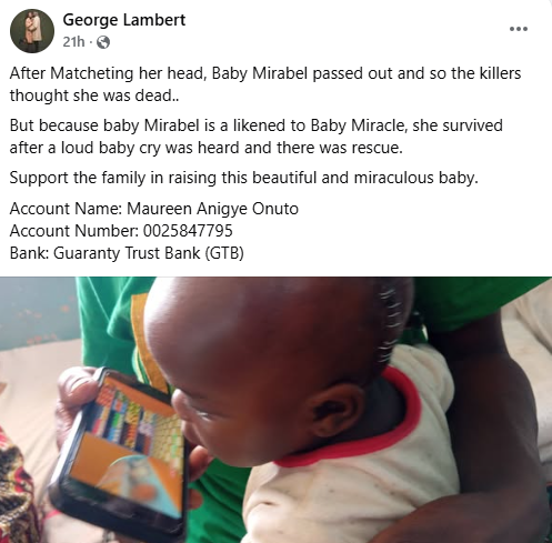 George Lambert, a community leader, who visited Mirabel in the hospital said that the baby survived because the attackers thought she died after they hit her with a machete on the head and she lost consciousness.