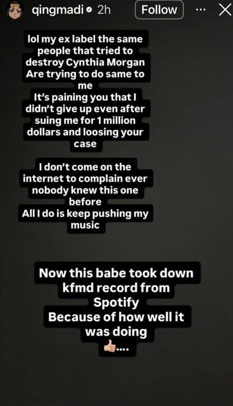 Qing Madi has alleged that her former record label is trying to “destroy” her the way they “tried to destroy Cynthia Morgan”.