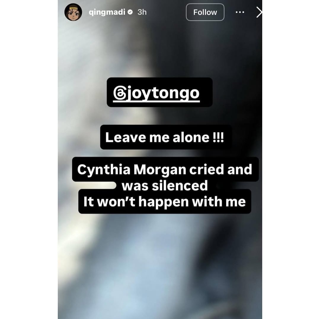She wrote: “Joy Tongo Leave me alone !!! Cynthia Morgan cried and was silenced. It won’t happen with me.”