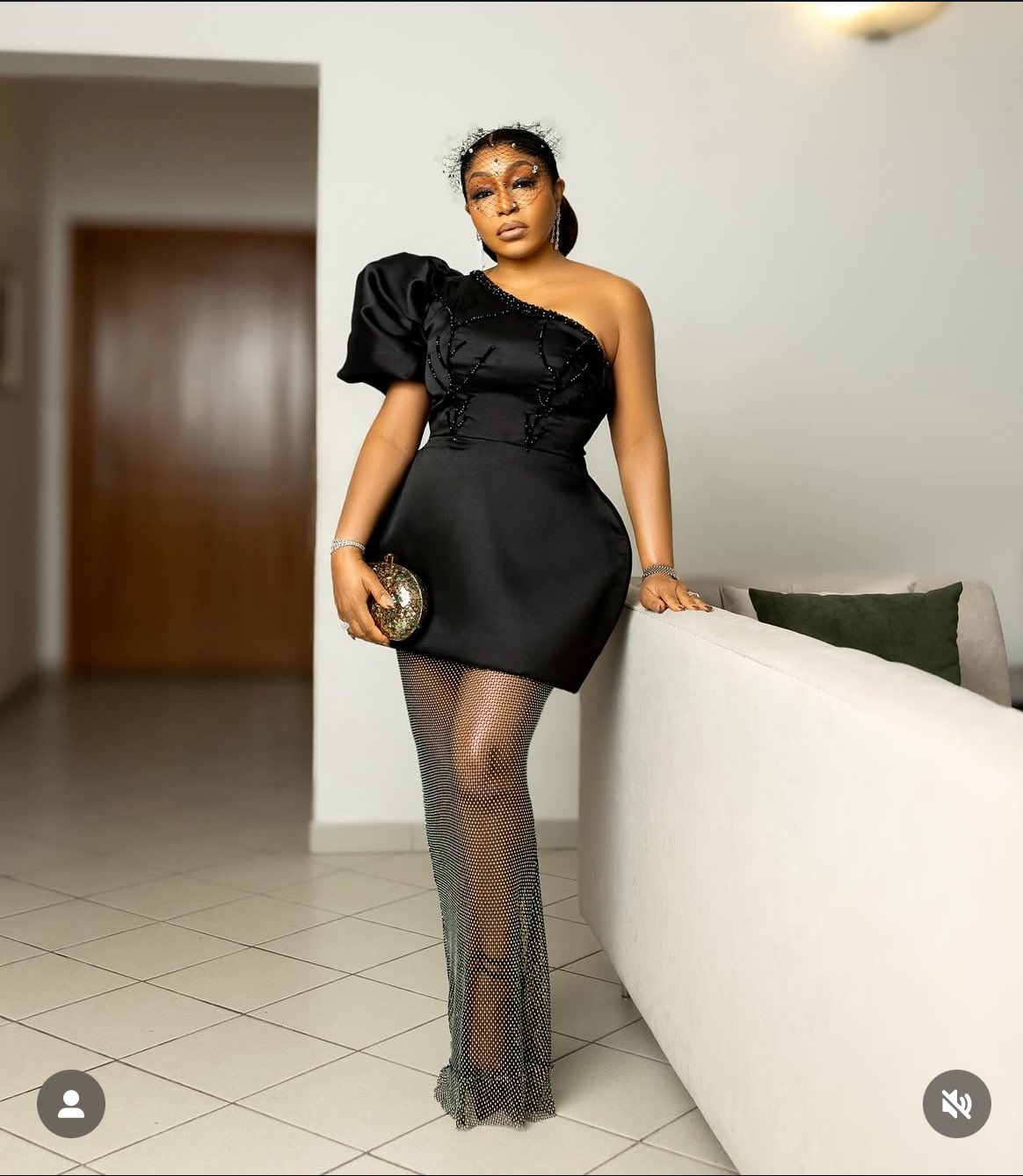 The original outfit won by Nollywood actress, Rita Dominic, featured a black one-shoulder dress with a fishnet.