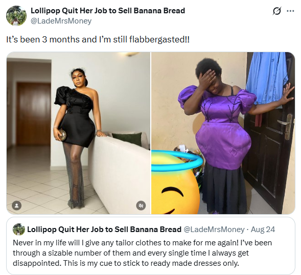 A Nigerian lady, Lade, is still reeling in disbelief three months after her tailor delivered a dress that wasn’t quite like what she had ordered.