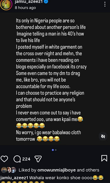 Reacting to the growing assumptions, Jamiu Azeez took to his Instagram page to express his frustration over what he described as unnecessary intrusion into his personal life. The actor emphasized that people were too quick to draw conclusions without facts, stressing that he never publicly announced a religious conversion.