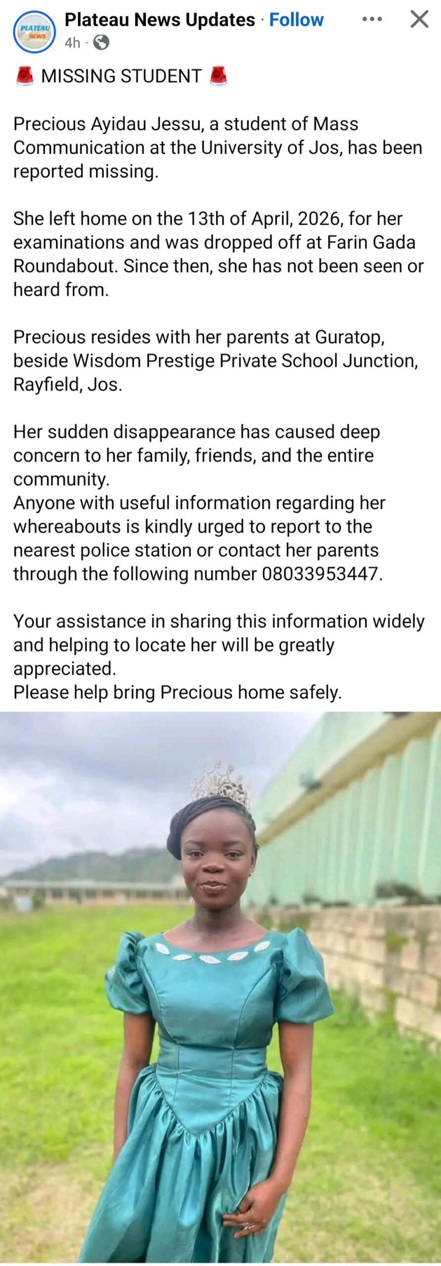 She reportedly left home on Monday, April 13, 2026, for an examination and was dropped at Farin Gada Roundabout in Jos, Plateau State.