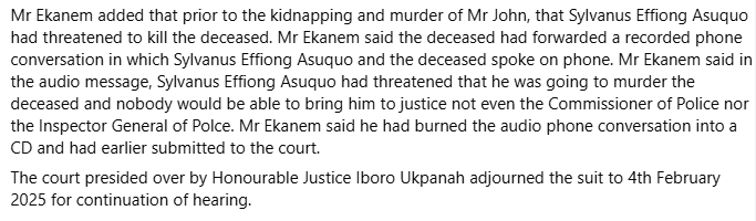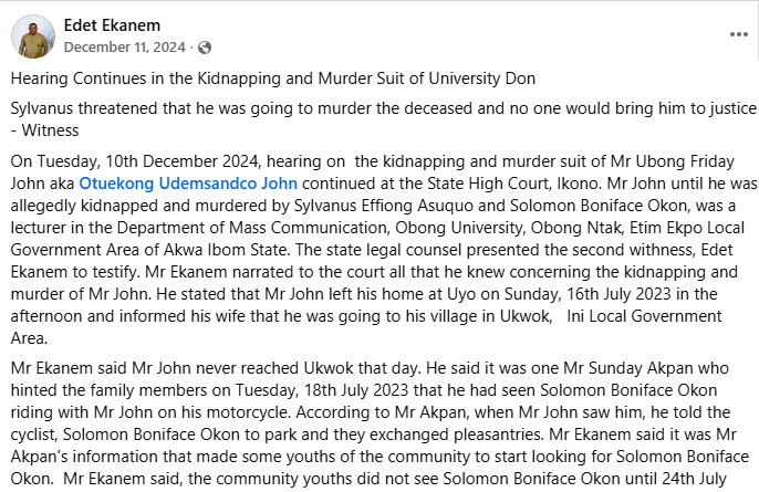 “Posthumous Birthday Celebration! Otuekong Udemsandco John, you would have been a year older today. But your friends Sylvanus Effiong Asukwo and Solomon Boniface Okon conspired, kidnapped and m8rdered you. Your m8rderers are standing trial in the court. We believe that justice will be served. Adieu dear!,” Ekanem wrote in a Facebook post on Saturday, November 22, 2025.