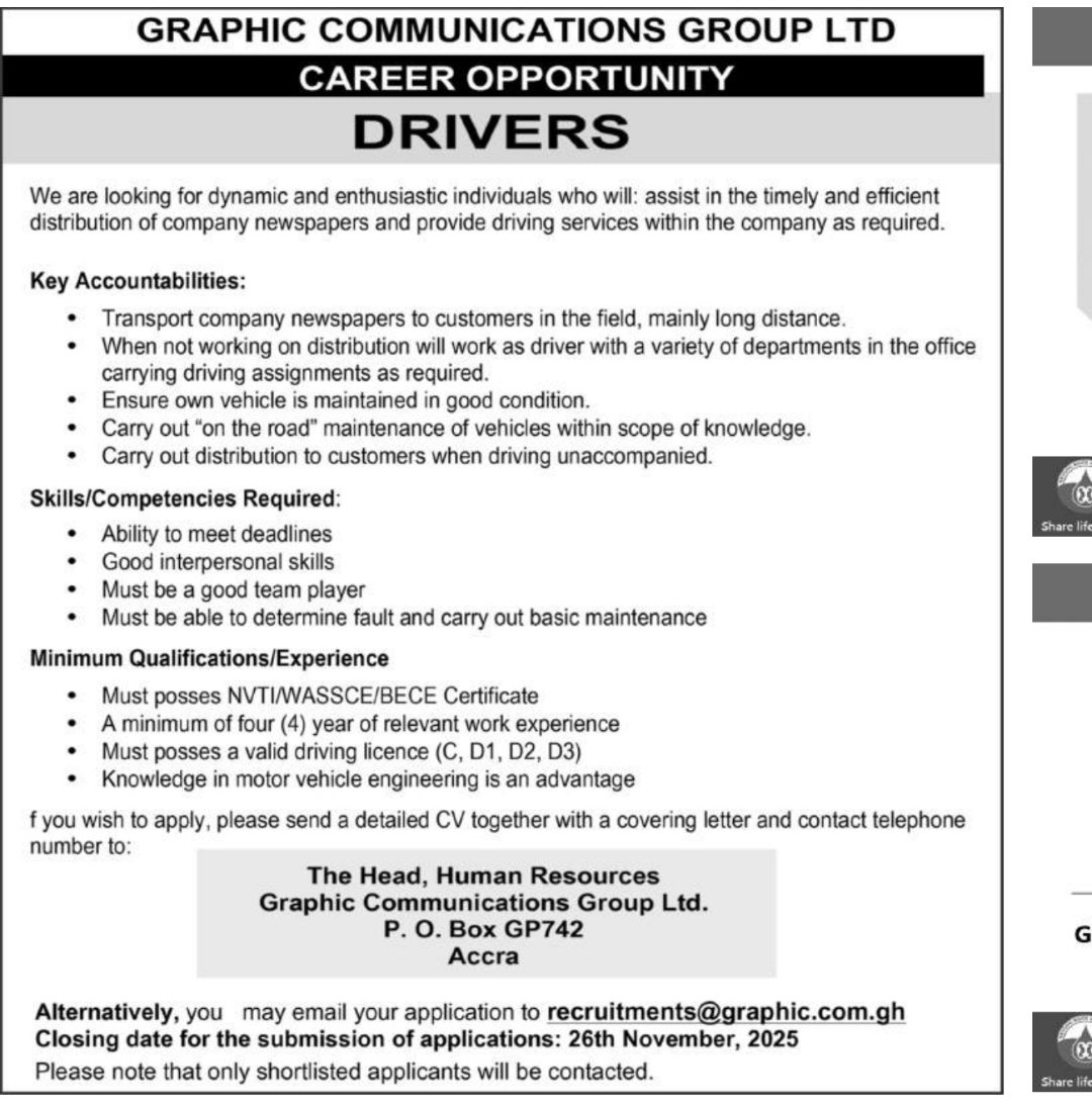 Prospective job seekers can find below the advertised jobs in the November 12, 2025, edition of the Daily Graphic as published in the paper today.
