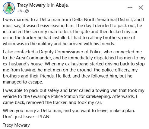 A Nigerian woman, Tracy Mcwary, has advised women married to Delta men to have a contingency plan before leaving their husbands.