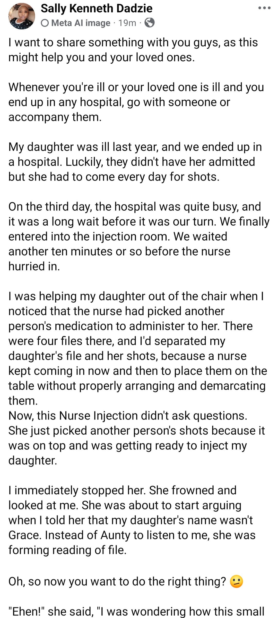 Sally Kenneth Dadzie took to Facebook to advice people to ensure they go with someone if they choose to visit the hospital when ill.