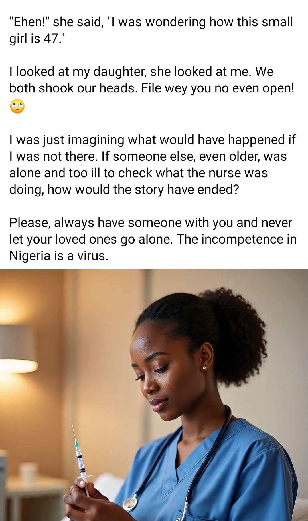 “Please, always have someone with you and never let your loved ones go alone. The incompetence in Nigeria is a virus.”