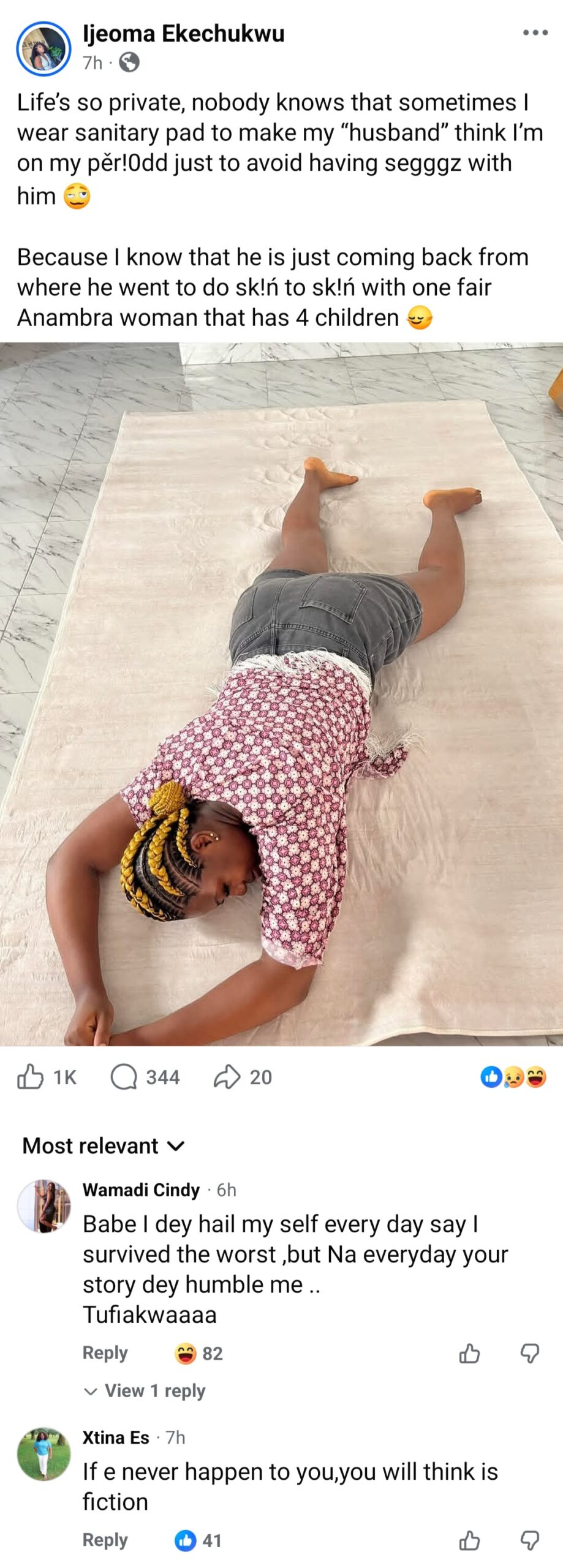 She wrote: “Life’s so private, nobody knows that sometimes I wear sanitary pad to make my ‘husband’ think I’m on my pěr!0dd just to avoid having segggz with him.