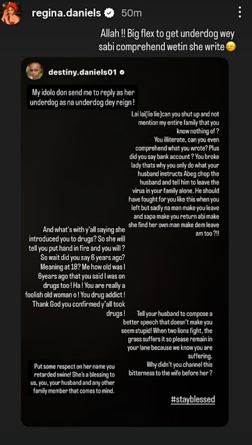 Sharing Destiny’s post on her Instagram story, Regina Daniels indirectly threw shade at Laila, writing: