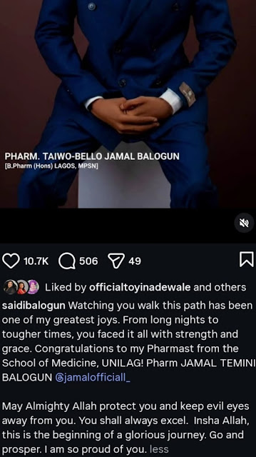 In his touching message, Saidi Balogun congratulated Jamal on officially stepping into the world of pharmacy, reinforcing his admiration with heartfelt prayers.