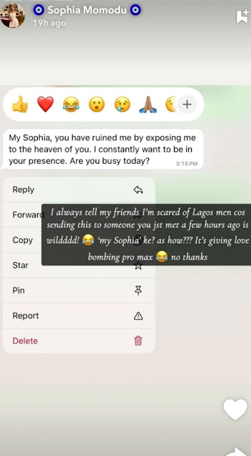 Expressing disbelief, she reacted: “I always tell my friends, I’m scared of Lagos men, cos sending this to someone you just met a few hours ago is wild. My Sophia nke? As how?? It’s giving love bombing pro max. No thanks.”