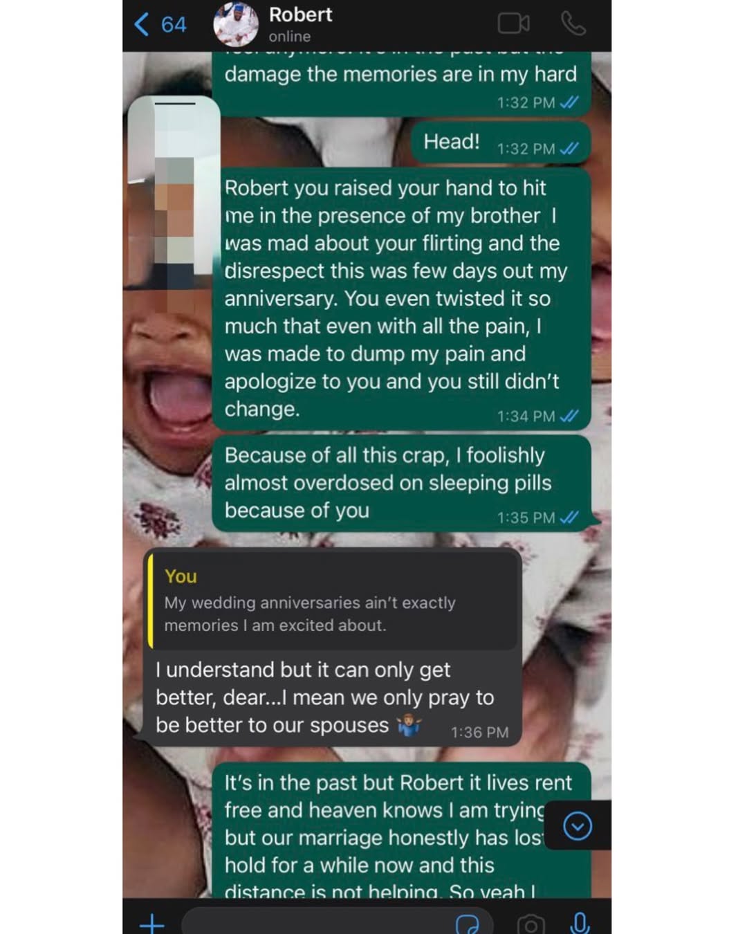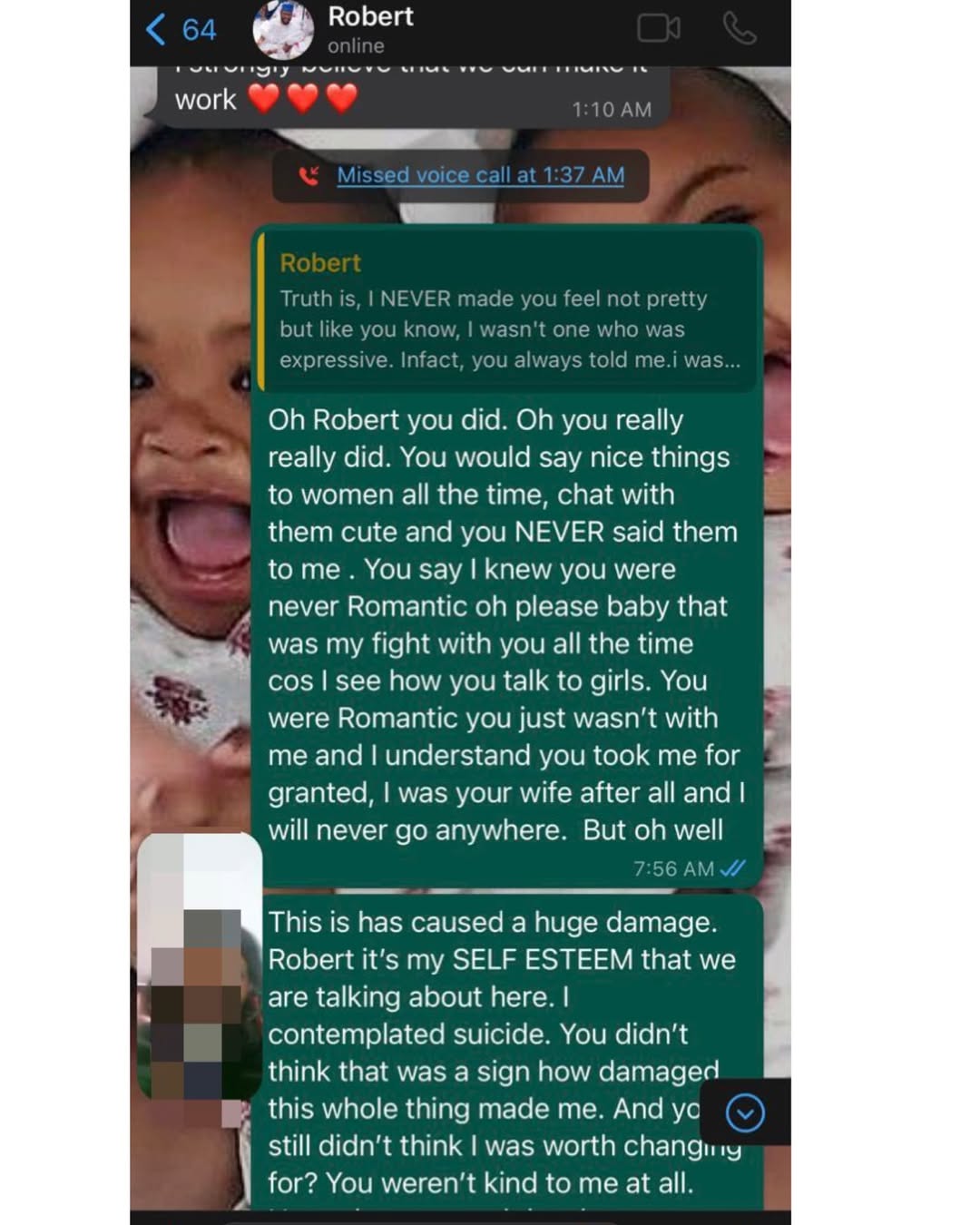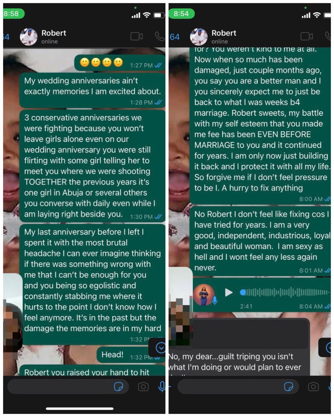 Chats purportedly exchanged between media personality Mayowa Lambe and her ex-husband Roby Ekpo have given a hint at what led to the end of their marriage.