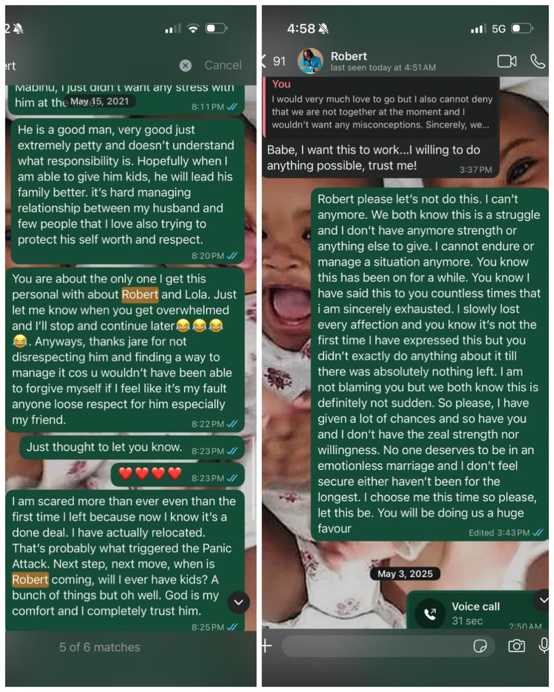 Other chats show Mayowa telling her friend that she wishes she could give Roby children so that “he will lead his family better.”