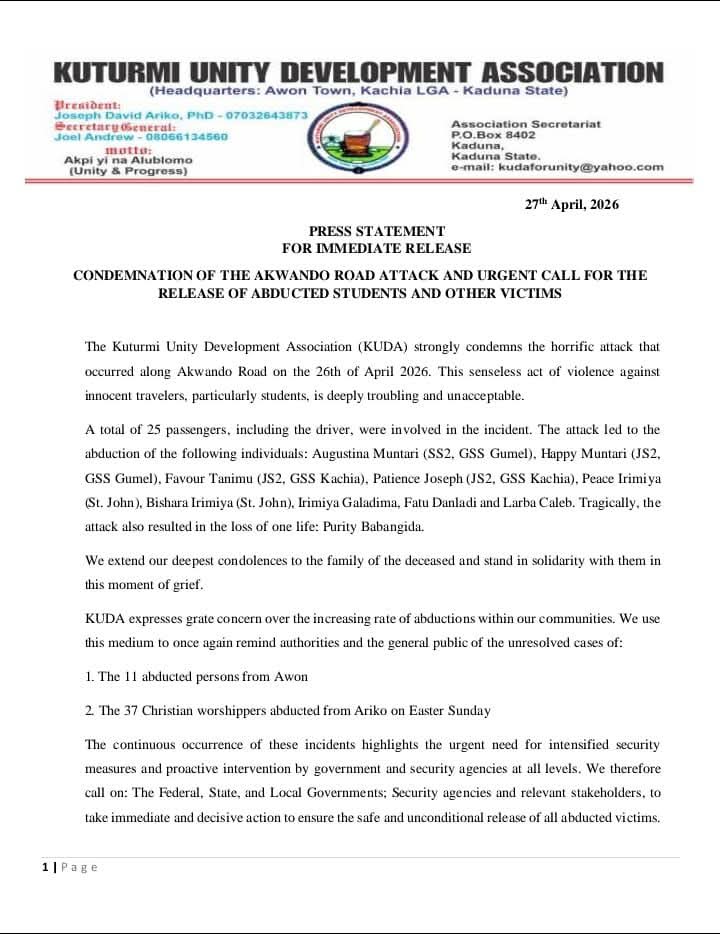 “Because most schools have resumed, children from Akwando village, Kachia LGA, were packed into a vehicle on Sunday, 26/04/2026, and being taken to Kachia so they could resume at their respective schools. Less than 10 minutes’ drive, armed bandits ambushed them on the road. Despite the driver’s efforts to escape, these schoolchildren were kidnapped,” he stated.