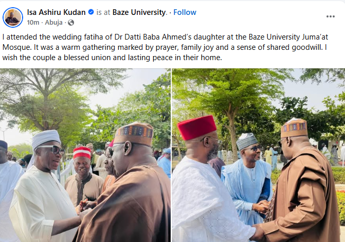 The wedding Fatiha was held at Sultan Sa’ad Mosque, Baze University, Abuja on Friday, December 12, 2025.